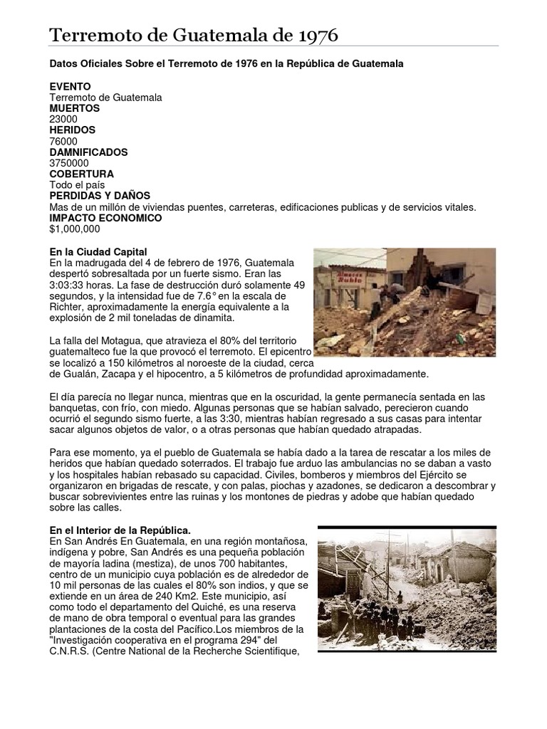 Terremoto en guatemala 1976 ¿por qué es necesario saber un plan de contingencia? Ülke çapındaki şehirler hasar gördü ve guatemala şehri'nin uzak bölgelerindeki çoğu kerpiç tipi evler yıkıldı. * pobladores mueren por derrumbes de viviendas. Con magnitud igual o superior a 3.0 (1). Redacción noticias al dia y a la hora 19 diciembre, 2019.